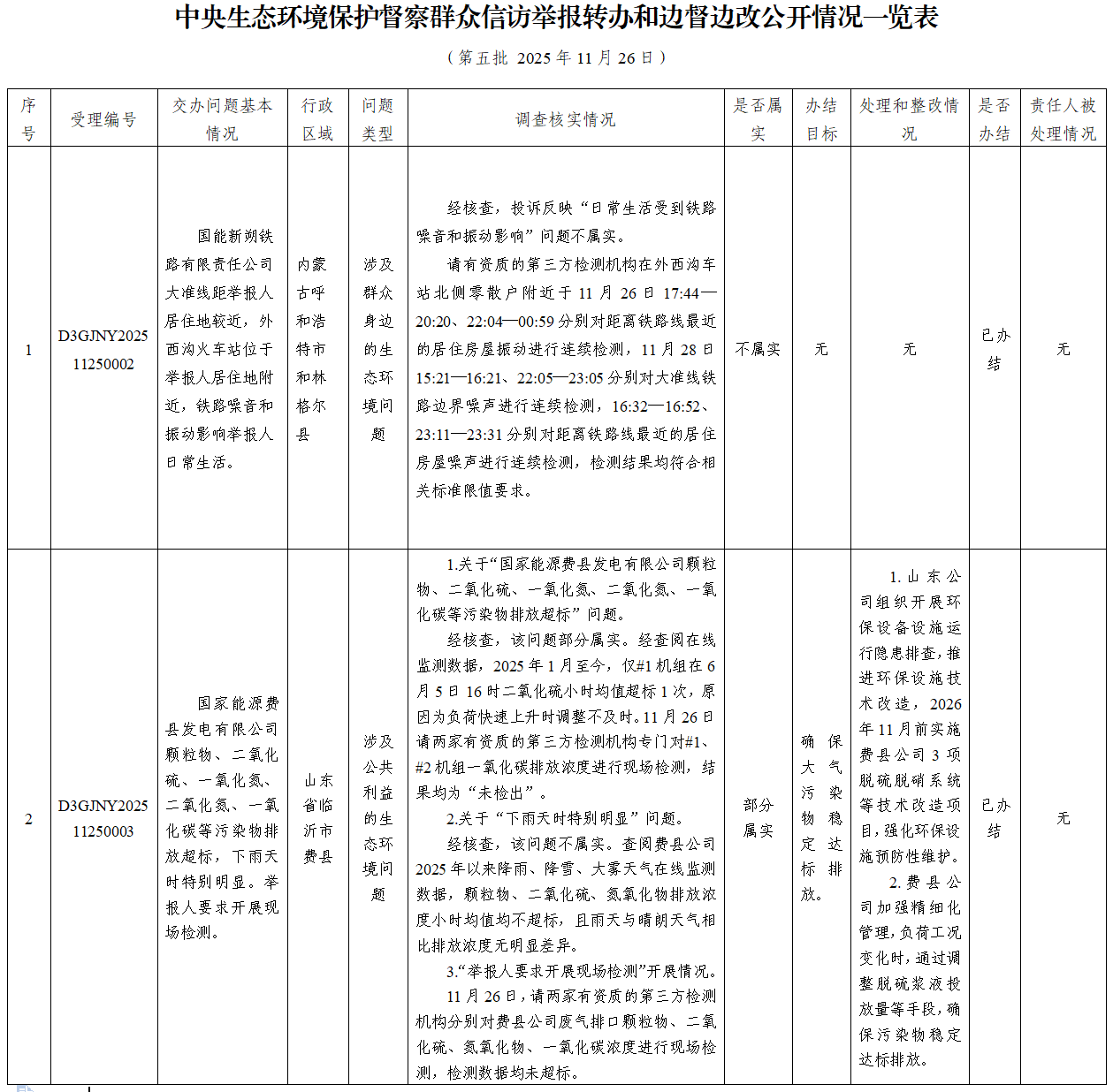 中央生态环境保护督察群众信访举报转办和边督边改公开情况一览表(第五批 2025年11月26日)