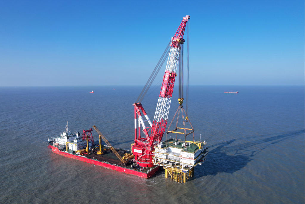 图为海南东方海上风电项目进行升压站安装