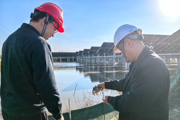 11月27日,龙源电力安徽公司滁州天长“渔光互补”项目汊涧汇流站,运维人员正开展日常巡检,养殖户赵大海热情地迎上前来:“刘工,快来瞧瞧这批蟹!壳色青亮、肚皮雪白,一对大钳子粗壮有力,再过半个月上市,准能卖个好价钱!”他指向光伏板下泛着碎银般波光的水面,语气中难掩激动,“谁能想到,光伏板底下也能养出‘致富蟹’,这日子真是越过越有盼头!”