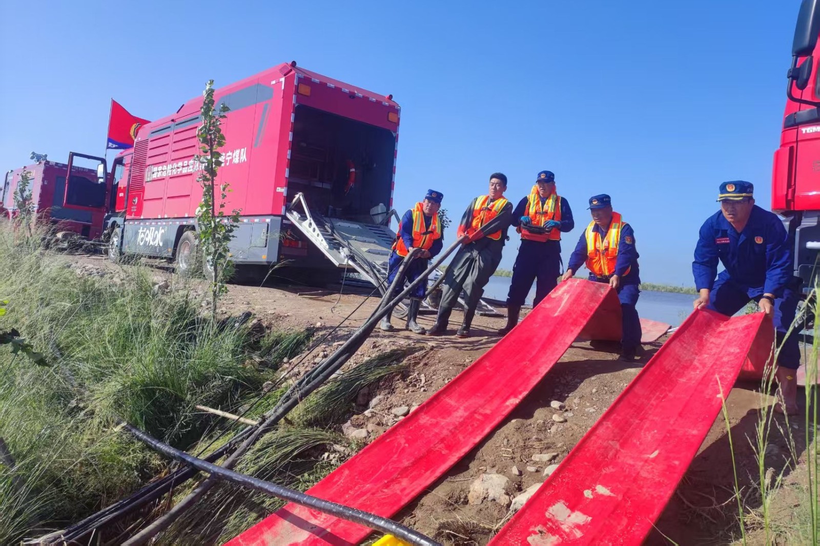图为宁煤应急救援总队跨区域增援内蒙古防汛救灾排涝任务